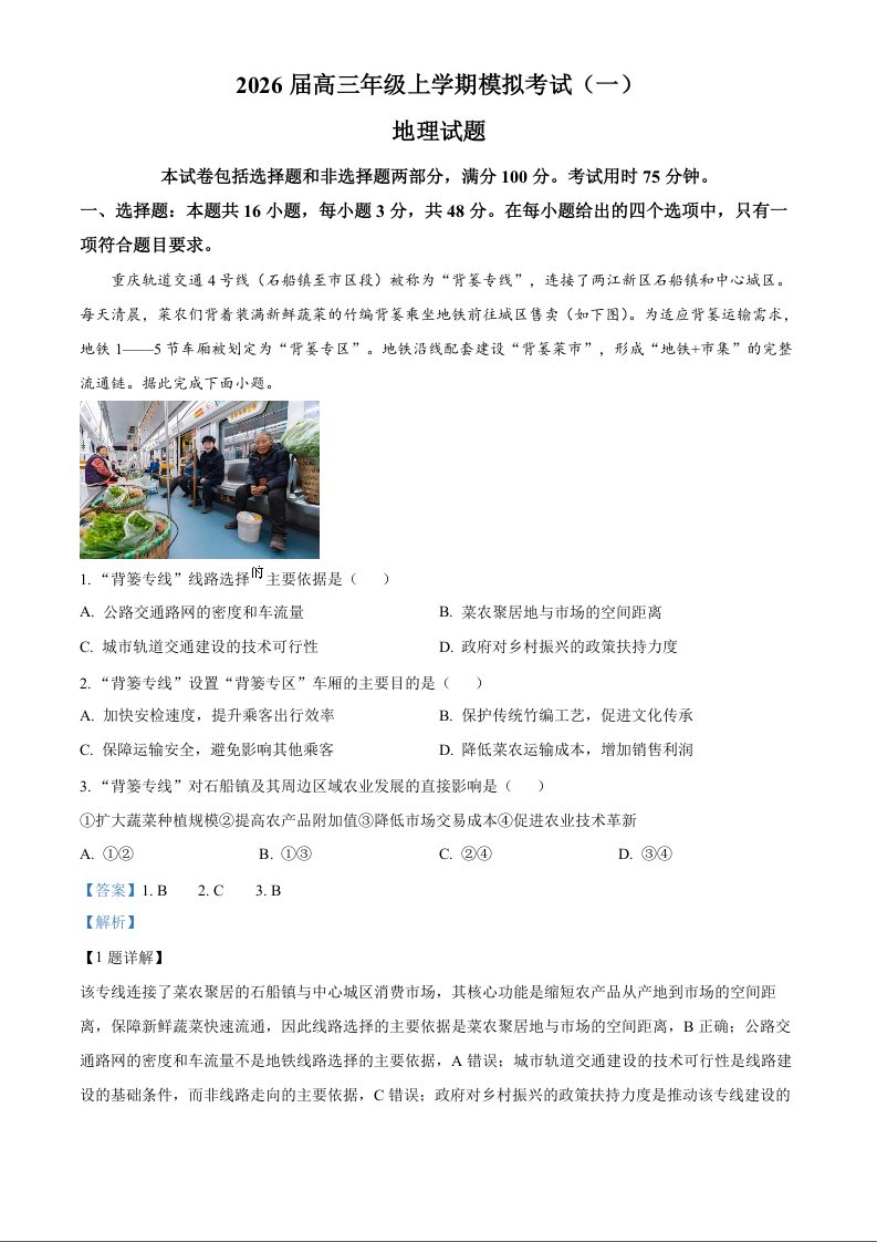 高三地理(解析版)--河北省名校协作体2026届高三上学期模拟考试(一)