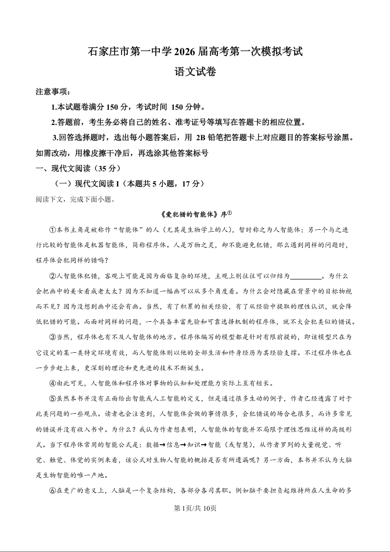 高三语文(原卷版)--河北石家庄市第一中学2026届高三高考第一次模拟考试
