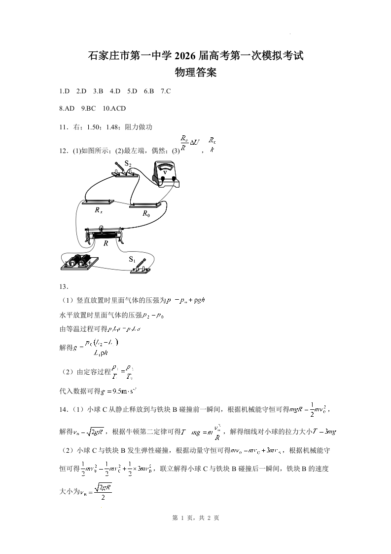 高三物理答案--河北石家庄市第一中学2026届高三高考第一次模拟考试