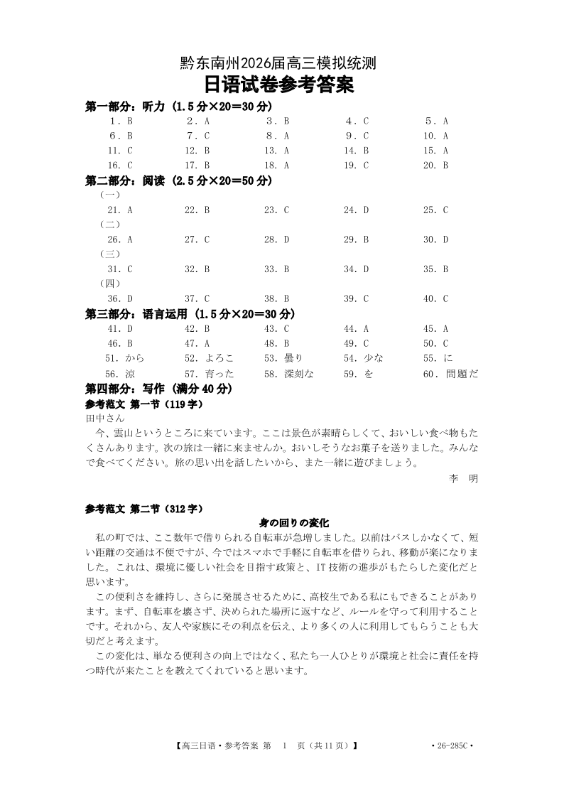 高三日语答案--贵州省黔东南州2026届高三3月模拟统测