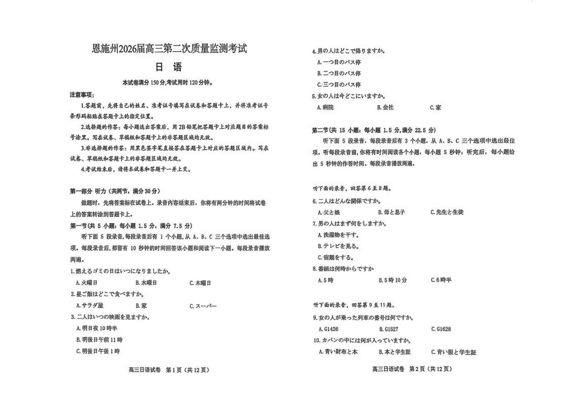 高三日语--湖北省恩施州2026届高三第二次质量监测考试(恩施二模)