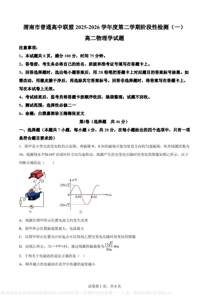 高二物理(原卷版)--陕西省渭南市普通高中联盟2025-2026学年高二下学期3月阶段检测