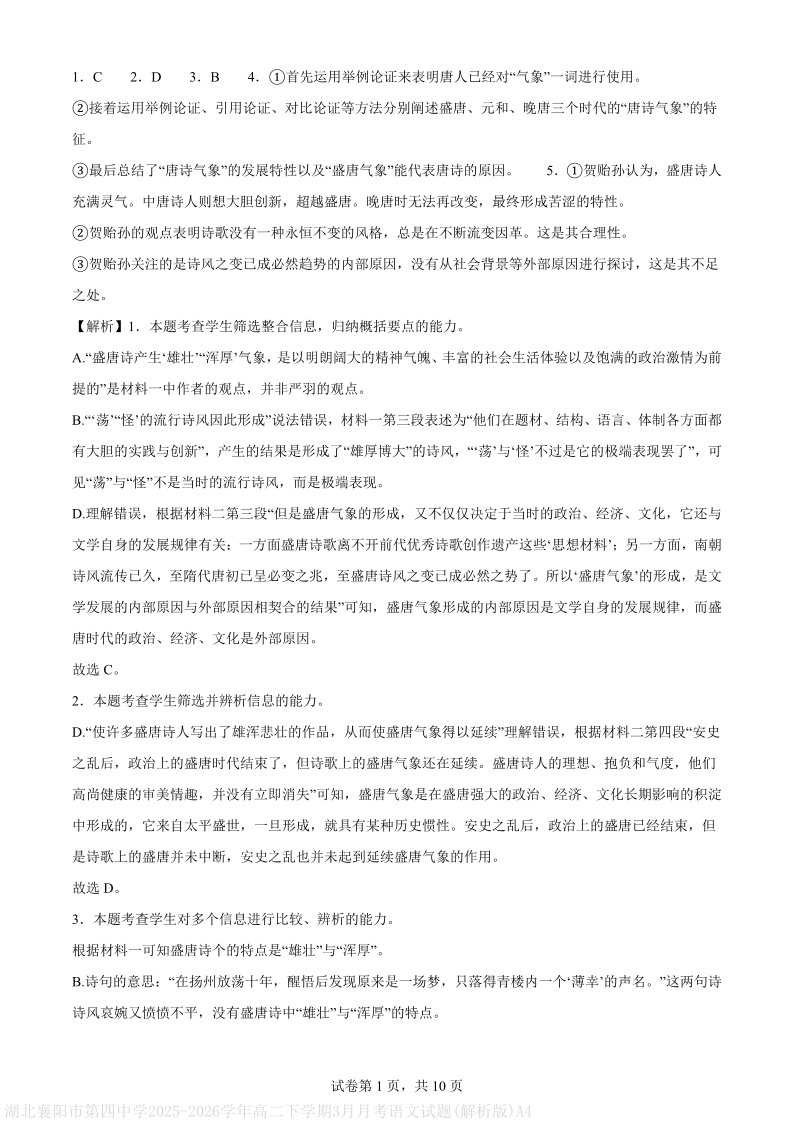 高二语文(解析版)--湖北省襄阳市第四中学2025-2026学年高二下学期3月阶段检测