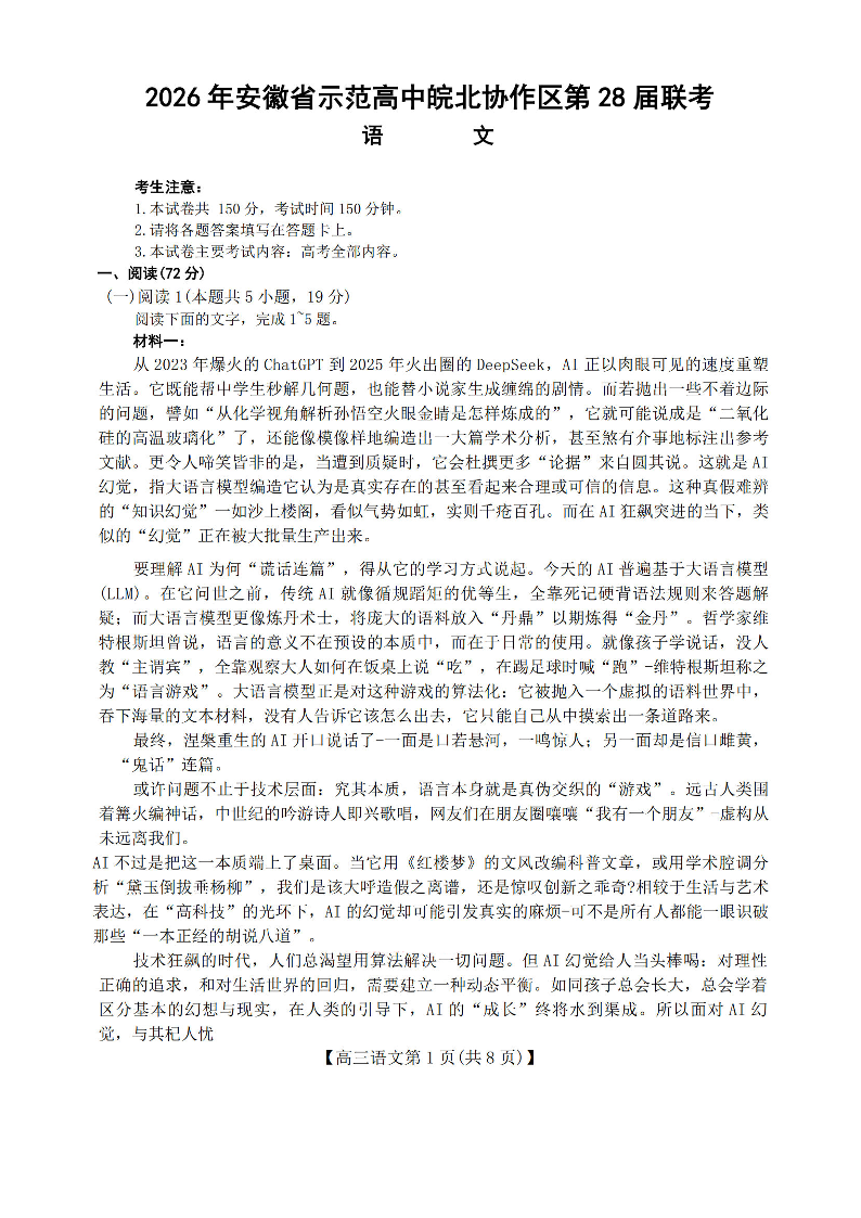 高三语文--安徽省2026届高三示范高中皖北协作区第28届联考(3月)