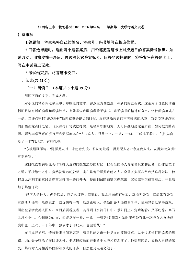 高三语文+答案--江西省五市十校协作体2026届高三3月第二次联考