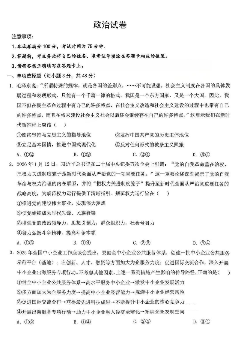 高三政治+答案--江西省五市十校协作体2026届高三3月第二次联考