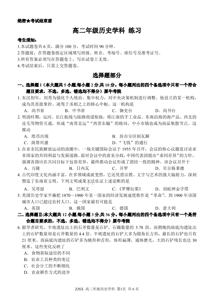 高二历史--浙江四校(含精诚联盟)2025-2026学年高二下学期3月阶段检测