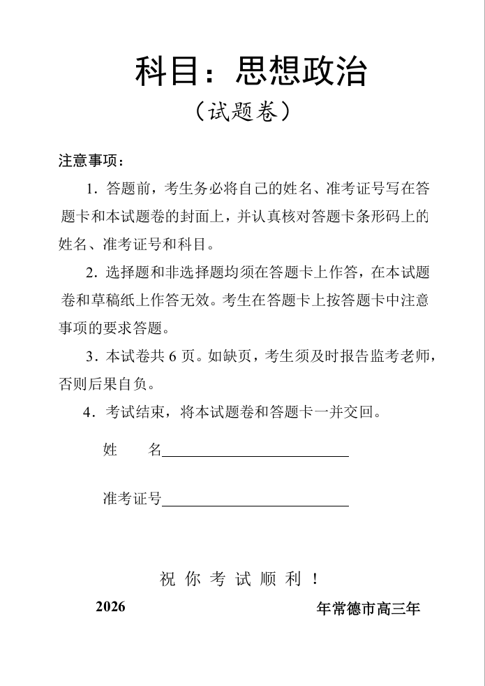 高三政治--湖南省常德市2026届高三下学期3月模拟考