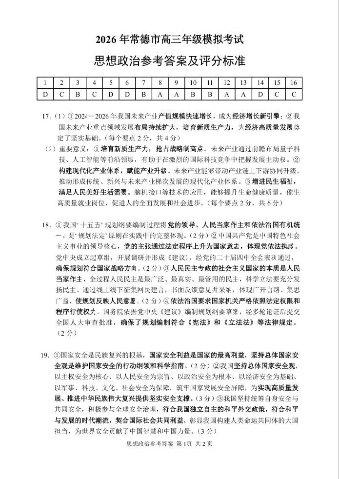 高三政治答案--湖南省常德市2026届高三下学期3月模拟考