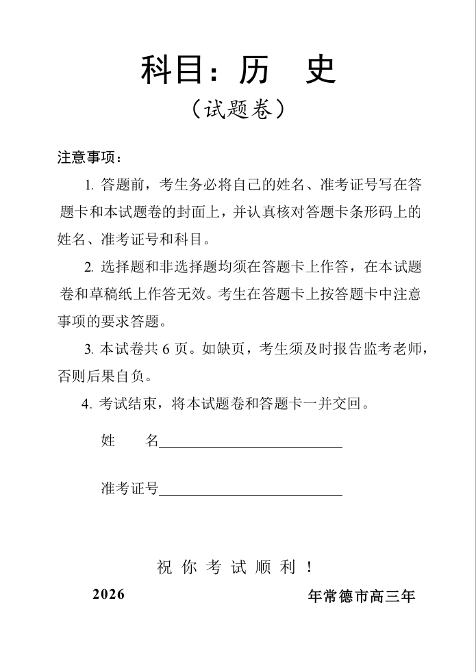 高三历史--湖南省常德市2026届高三下学期3月模拟考