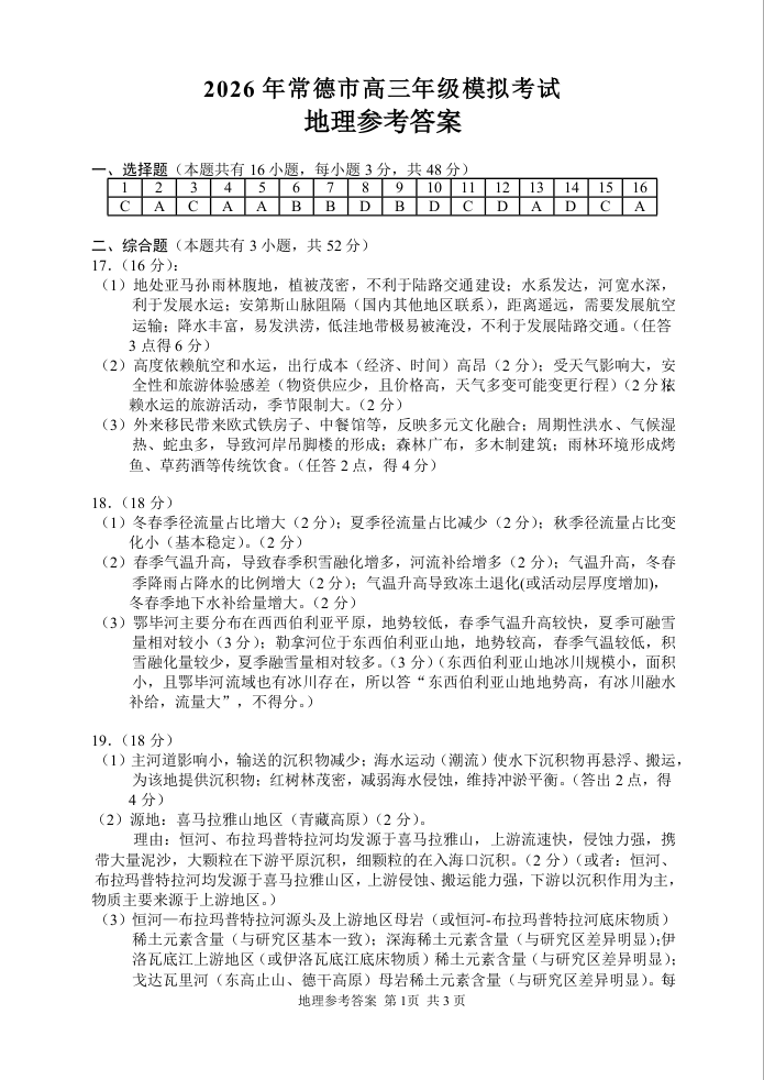 高三地理答案--湖南省常德市2026届高三下学期3月模拟考