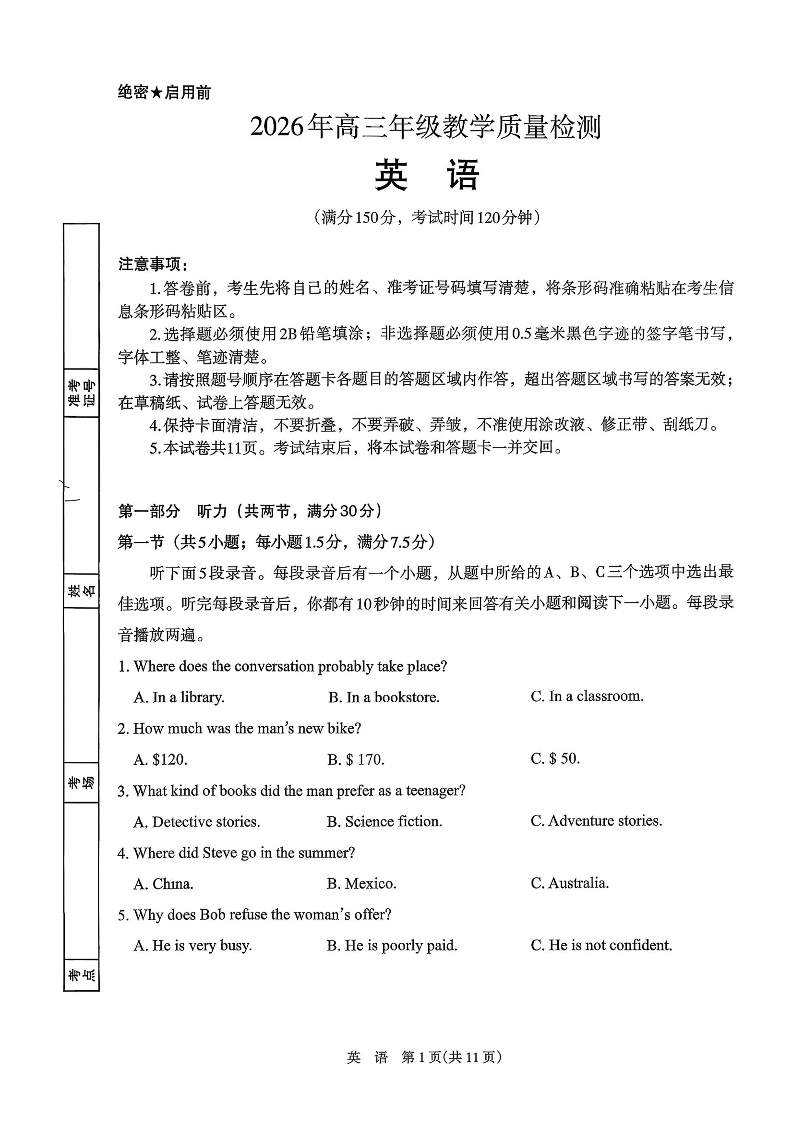 高三英语--宁夏银川市、石嘴山市、吴忠市三市2026届高三下学期3月学科教学质量检测