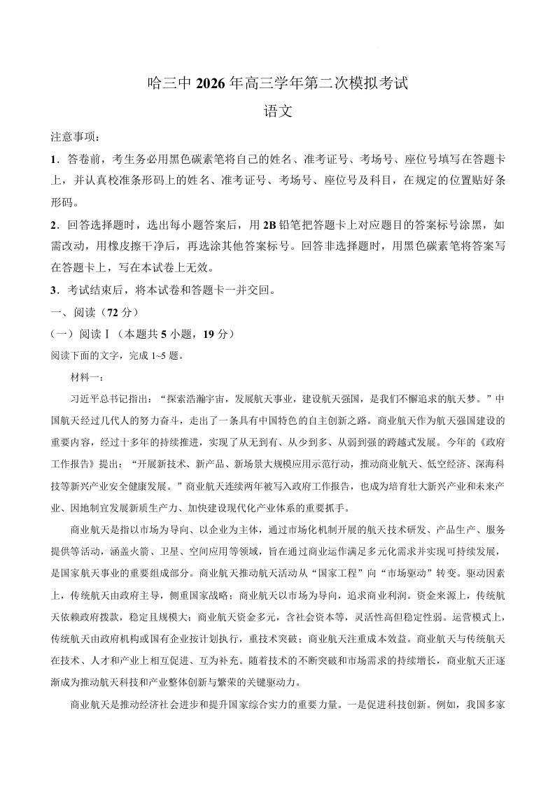 高三语文--黑龙江省哈尔滨市第三中学校2026届高三下学期第二次模拟考试