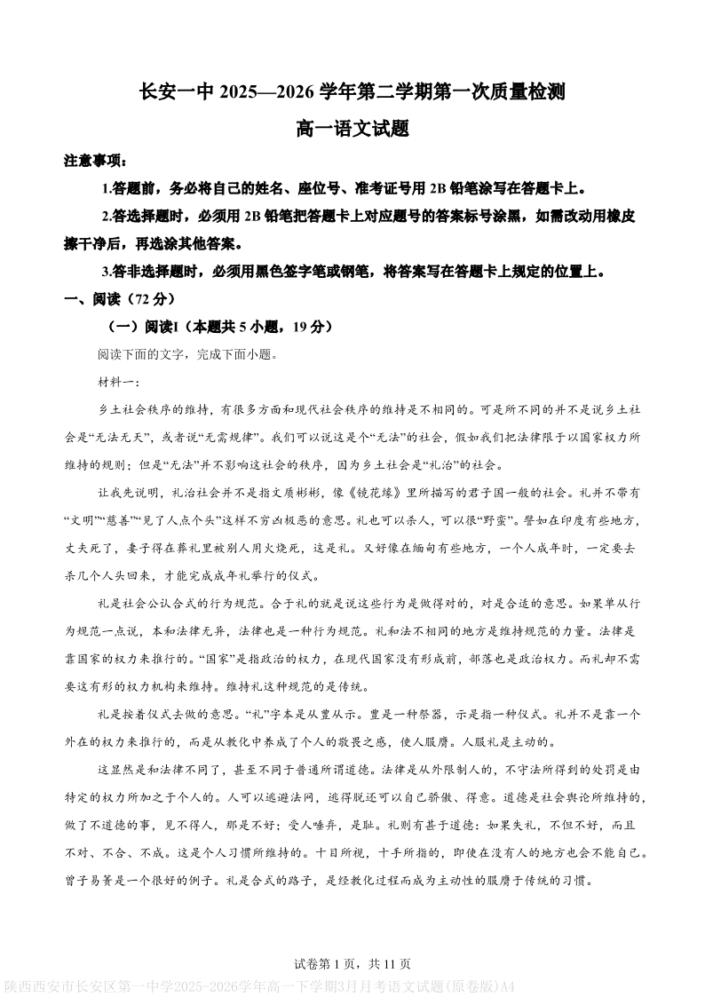 高一语文(原卷版)--陕西省西安市长安区第一中学2025-2026学年高一下学期3月阶段检测
