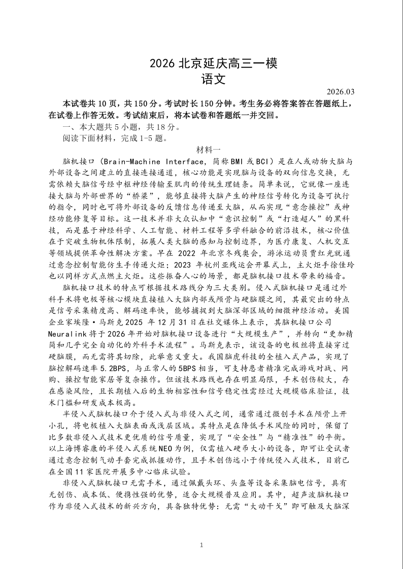 高三语文+答案--北京市延庆区2026届第二学期高三一模考试(延庆一模)