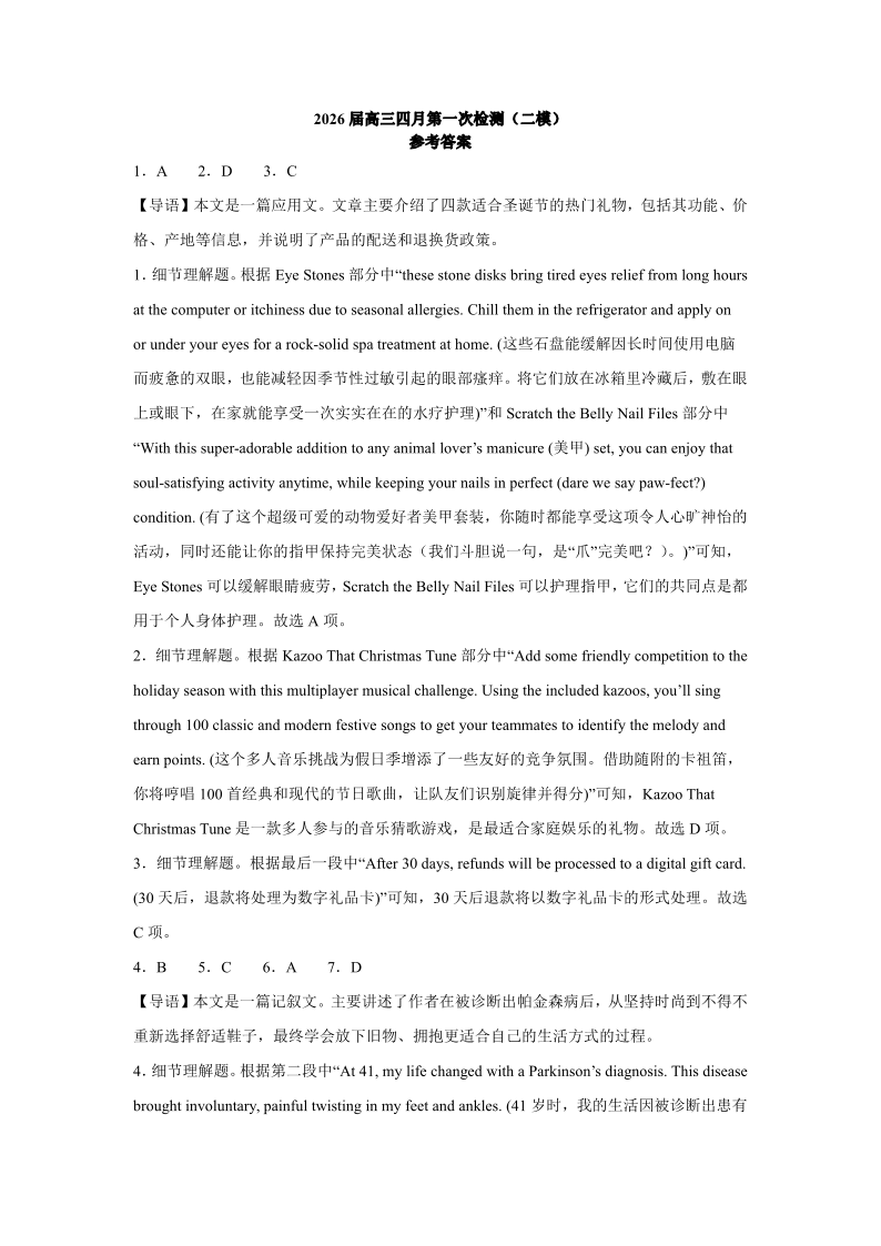 高三英语答案--江苏省南京市第六十六中学2026届高三四月第一次检测(二模)