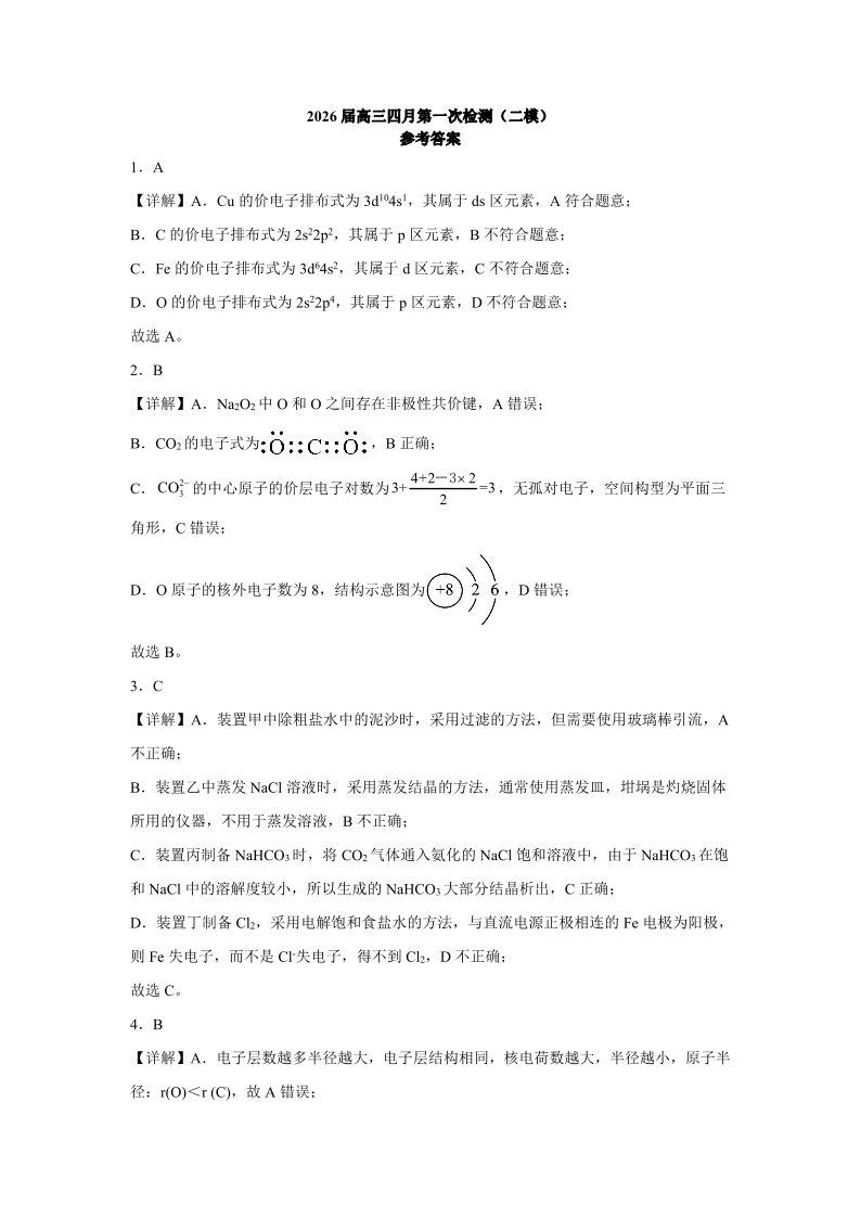 高三化学答案--江苏省南京市第六十六中学2026届高三四月第一次检测(二模)