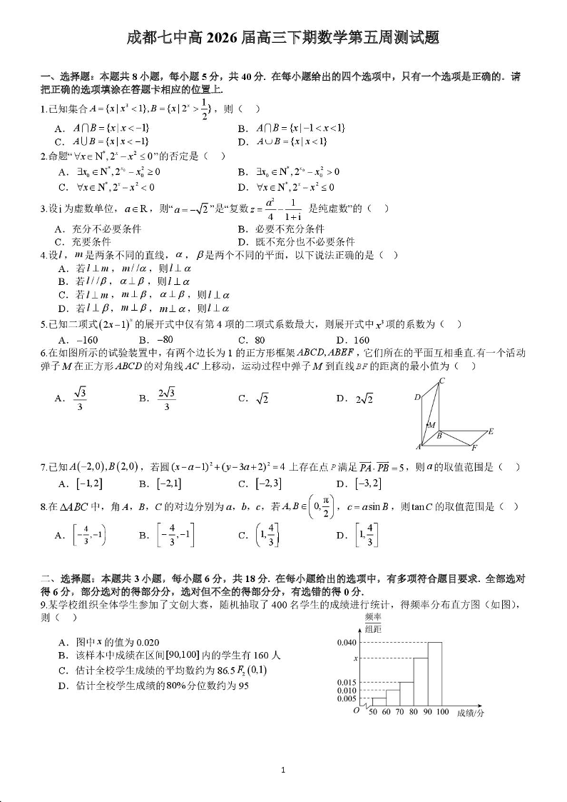 高三数学--四川省成都市第七中学2026届高三下学期数学第五周测