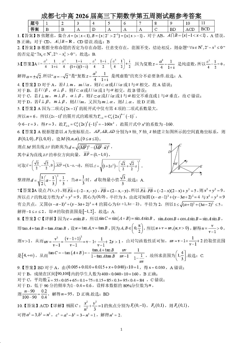 高三数学答案--四川省成都市第七中学2026届高三下学期数学第五周测