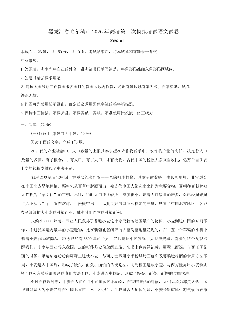 高三语文+答案--黑龙江省哈尔滨市2026届高三下学期第一次模拟考试