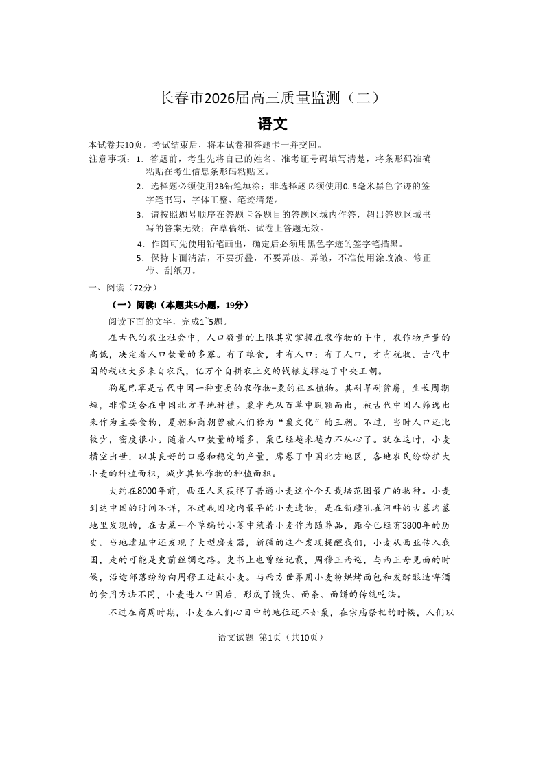 高三语文--吉林省长春市2026届高三质量监测(二)(长春二模)