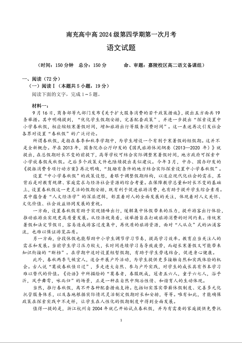 高二语文--四川省南充高级中学2025-2026学年高二下学期第一次月考