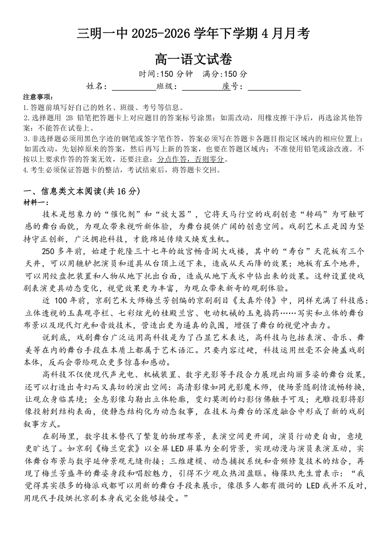 高一语文+答案--福建省三明市重点校2025-2026学年高一下学期4月月考