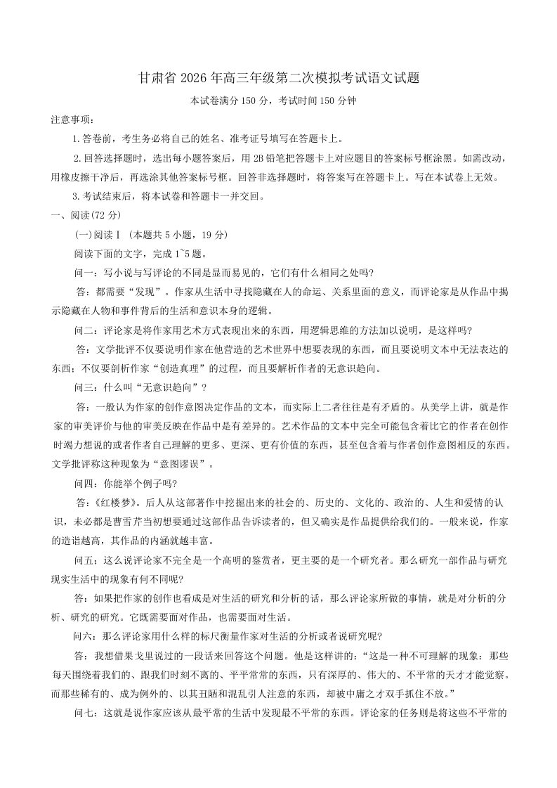 高三语文+答案--甘肃省2026届高三第二次模拟考试(甘肃二模)