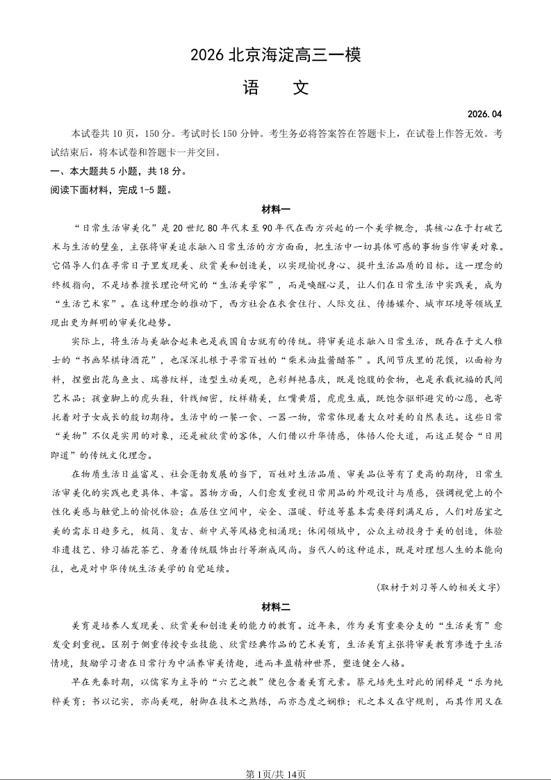 高三语文+答案--北京市海淀区2026届高三下学期一模考试