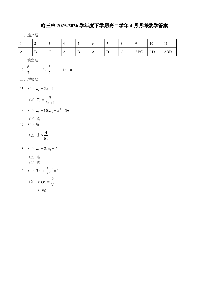 高二数学答案--黑龙江省哈尔滨市第三中学2025—2026学年度下学期高二学年4月月考