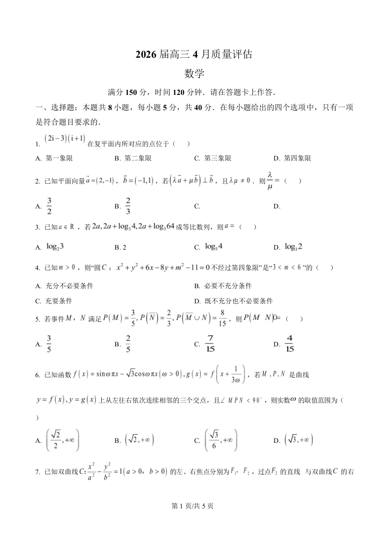 高三数学(原卷版)--安徽省A10联盟2026届高三下学期4月阶段检测