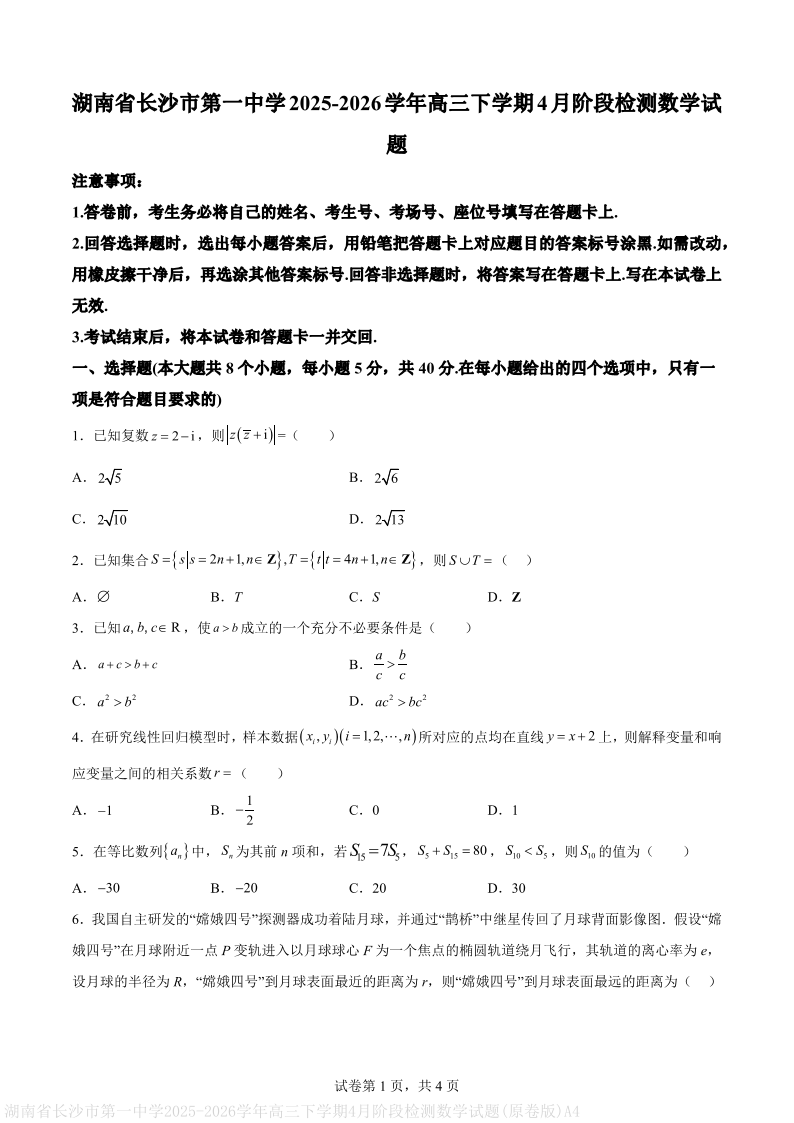 高三数学--湖南省长沙市第一中学2026届高三下学期4月阶段检测