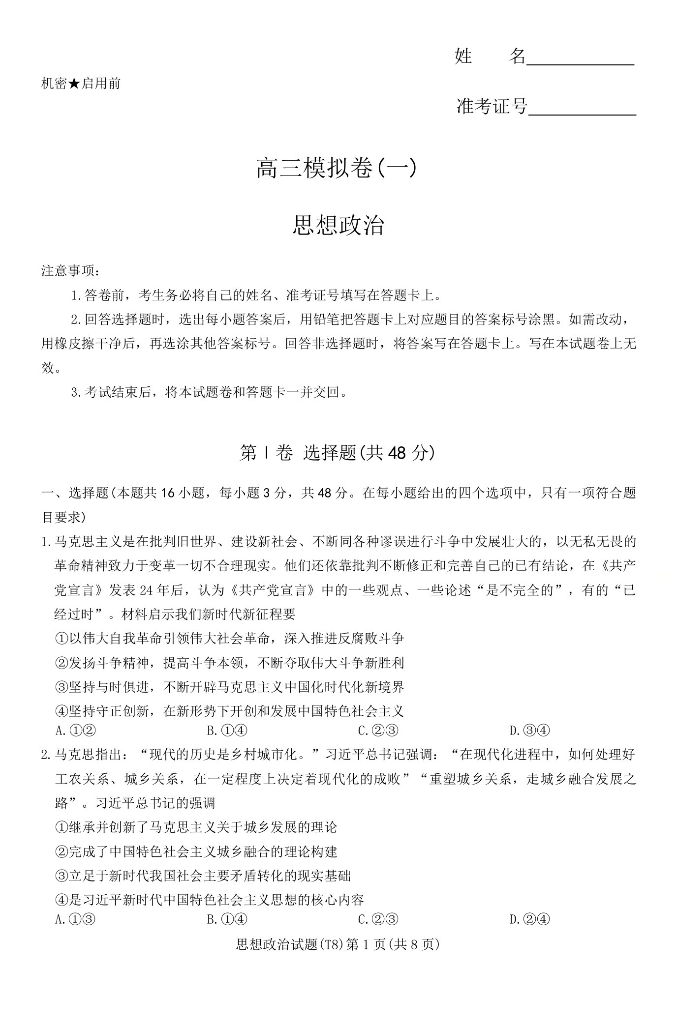 高三政治+答案--湖南师范大学附属中学2026届高三下学期模拟卷(一)