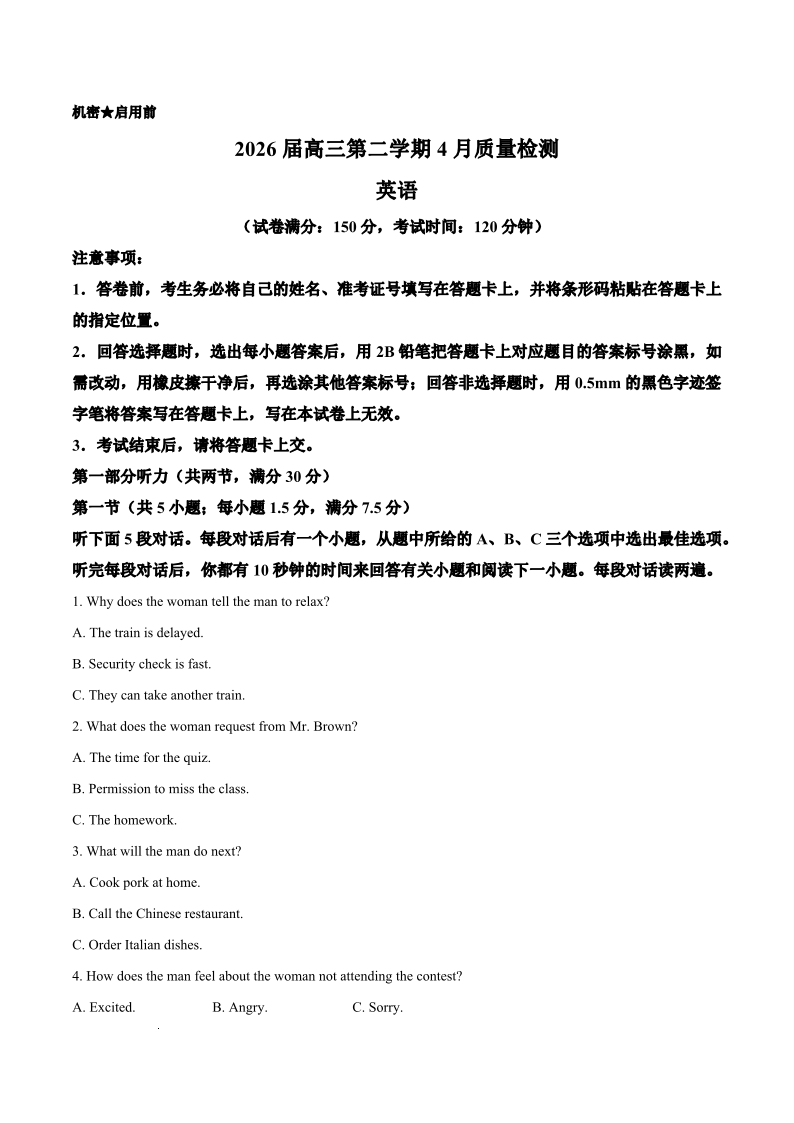 高三英语--安徽华师联盟2026届高三第二学期4月质量检测