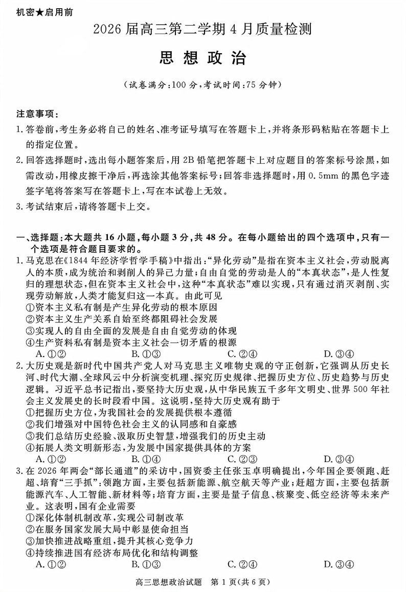 高三政治--安徽华师联盟2026届高三第二学期4月质量检测