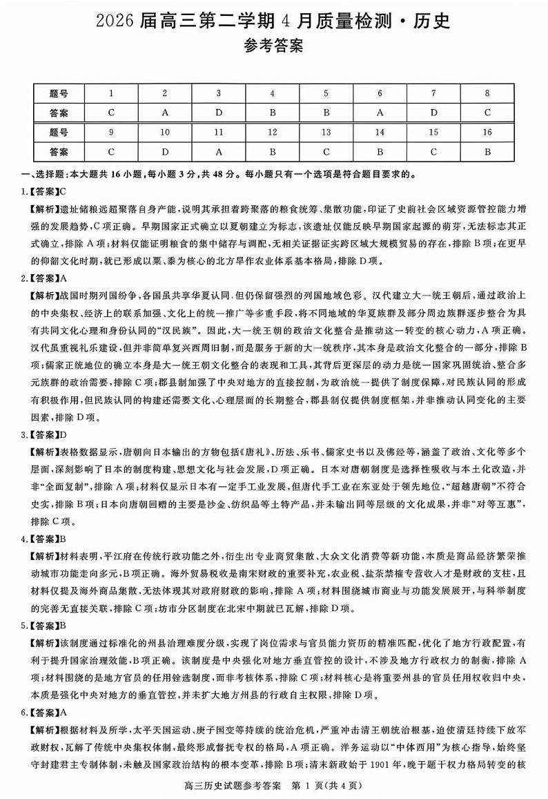 高三历史答案--安徽华师联盟2026届高三第二学期4月质量检测