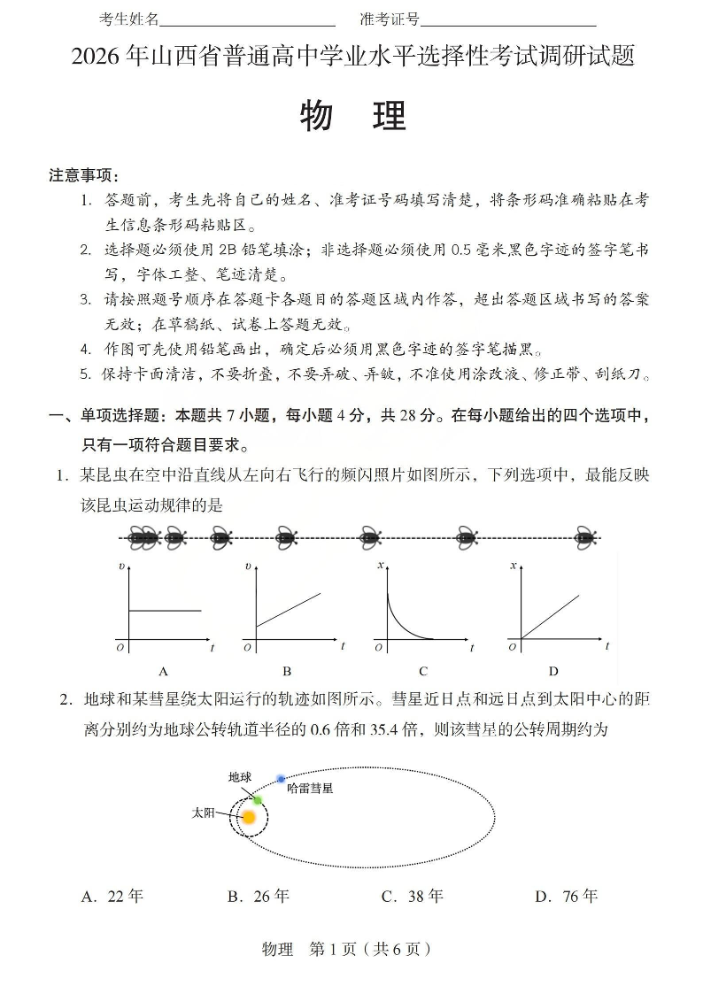 高三物理--山西省2026年普通高中学业水平选择性考试调研