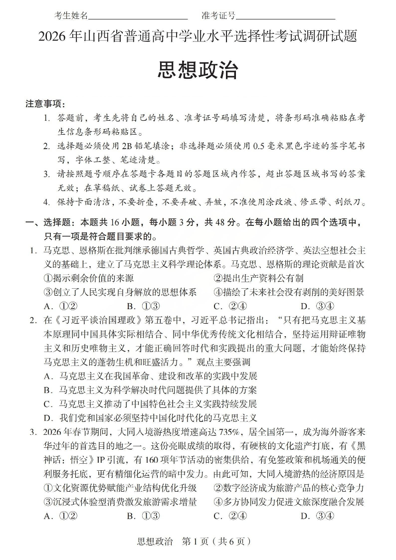 高三政治--山西省2026年普通高中学业水平选择性考试调研