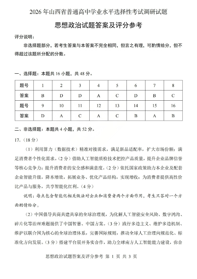 高三政治答案--山西省2026年普通高中学业水平选择性考试调研