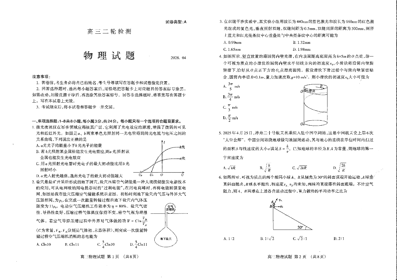 高三物理--山东省泰安市2026届高三下学期4月二轮检测(泰安二模)