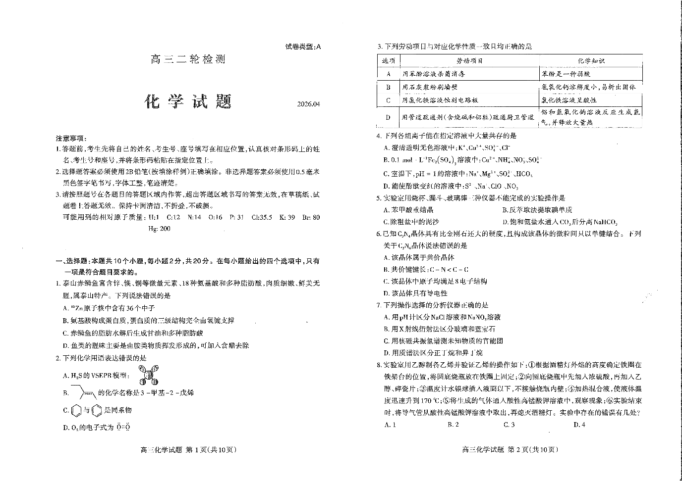 高三化学--山东省泰安市2026届高三下学期4月二轮检测(泰安二模)
