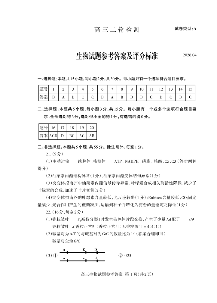 高三生物答案--山东省泰安市2026届高三下学期4月二轮检测(泰安二模)