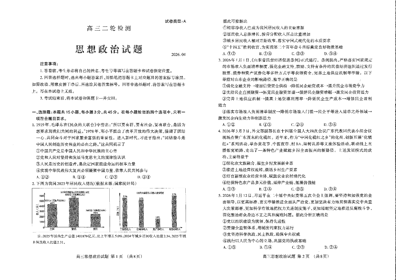 高三政治--山东省泰安市2026届高三下学期4月二轮检测(泰安二模)
