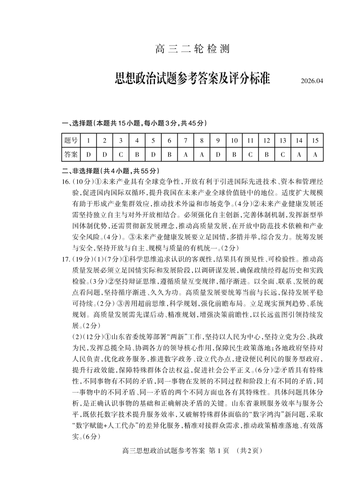 高三政治答案--山东省泰安市2026届高三下学期4月二轮检测(泰安二模)
