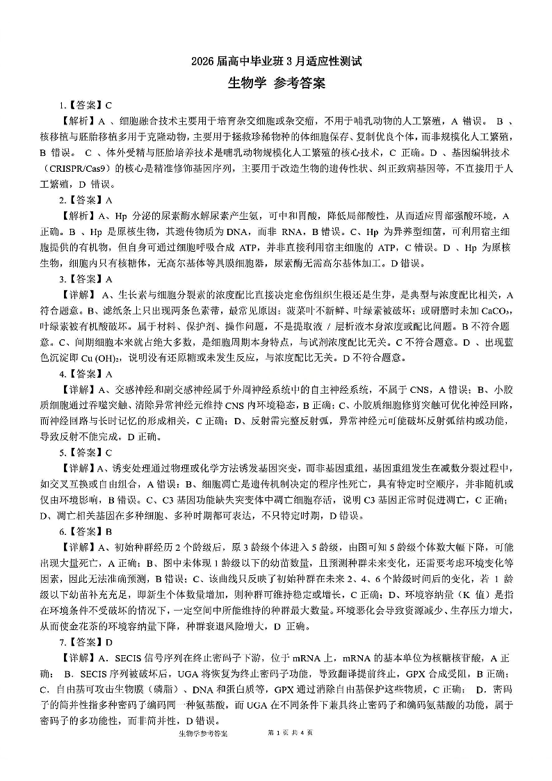 高三生物答案--广西柳州市2026届高三年级高考适应性考试