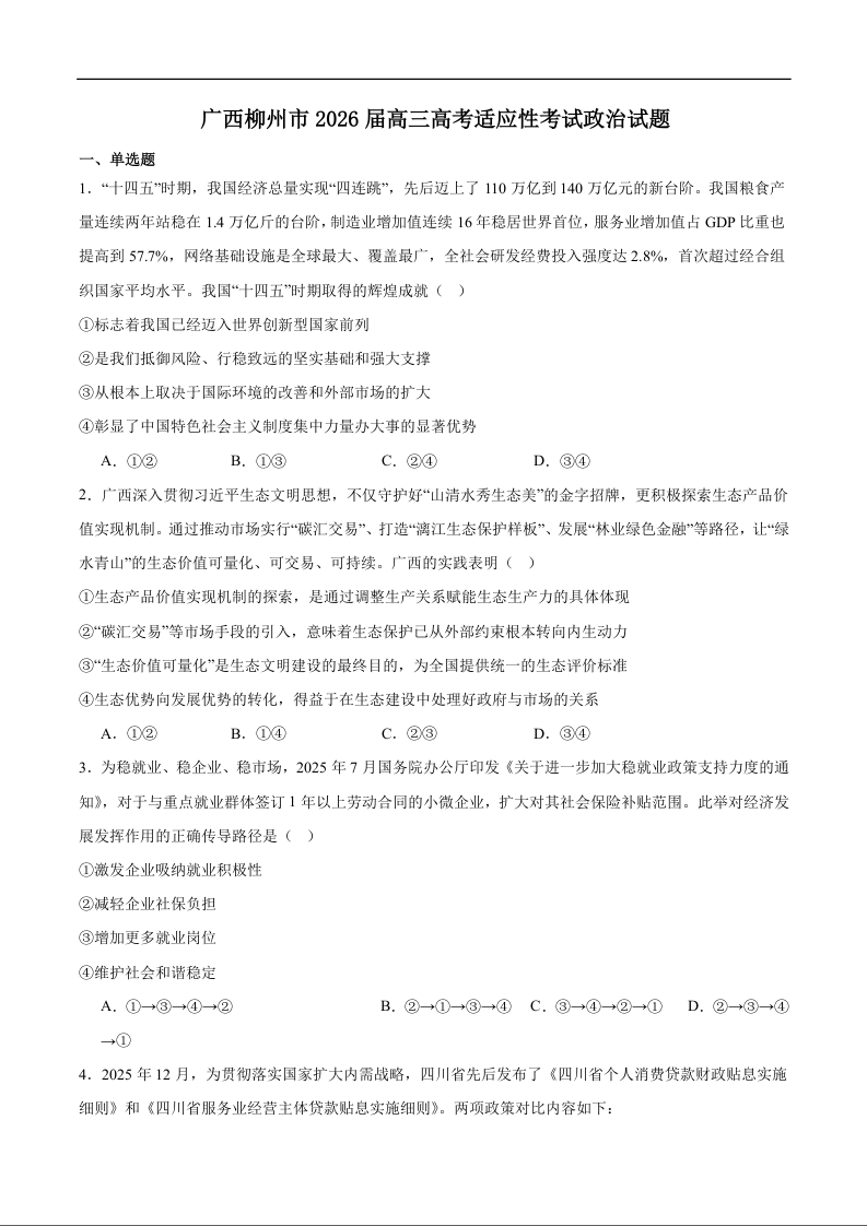 高三政治+答案--广西柳州市2026届高三年级高考适应性考试