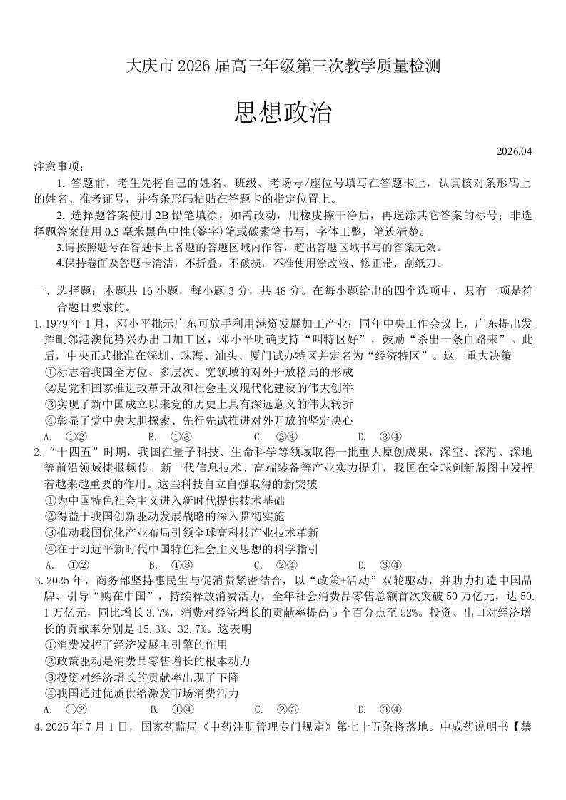 高三政治--黑龙江省大庆市2026届高三第三次教学质量检测