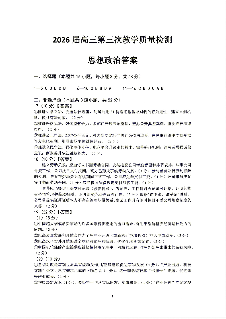 高三政治答案--黑龙江省大庆市2026届高三第三次教学质量检测