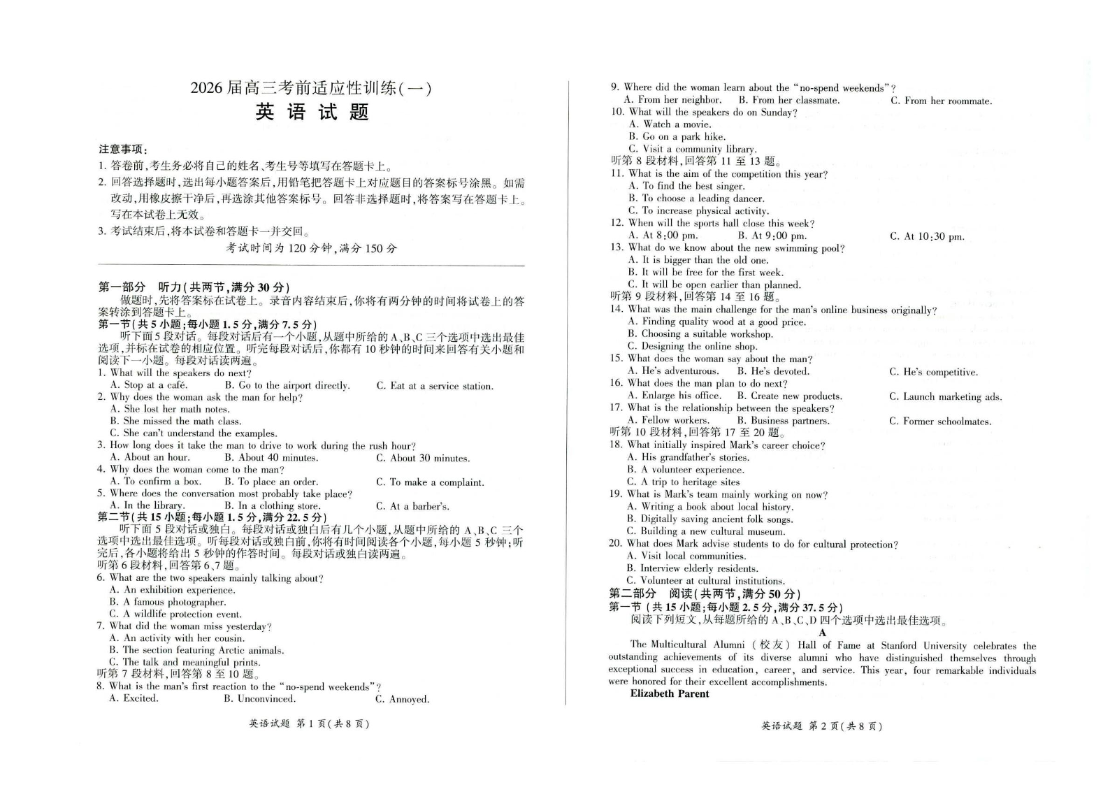 高三英语--百师联盟2026届高三考前适应性训练(一)