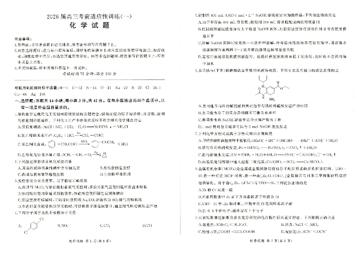 高三化学--百师联盟2026届高三考前适应性训练(一)